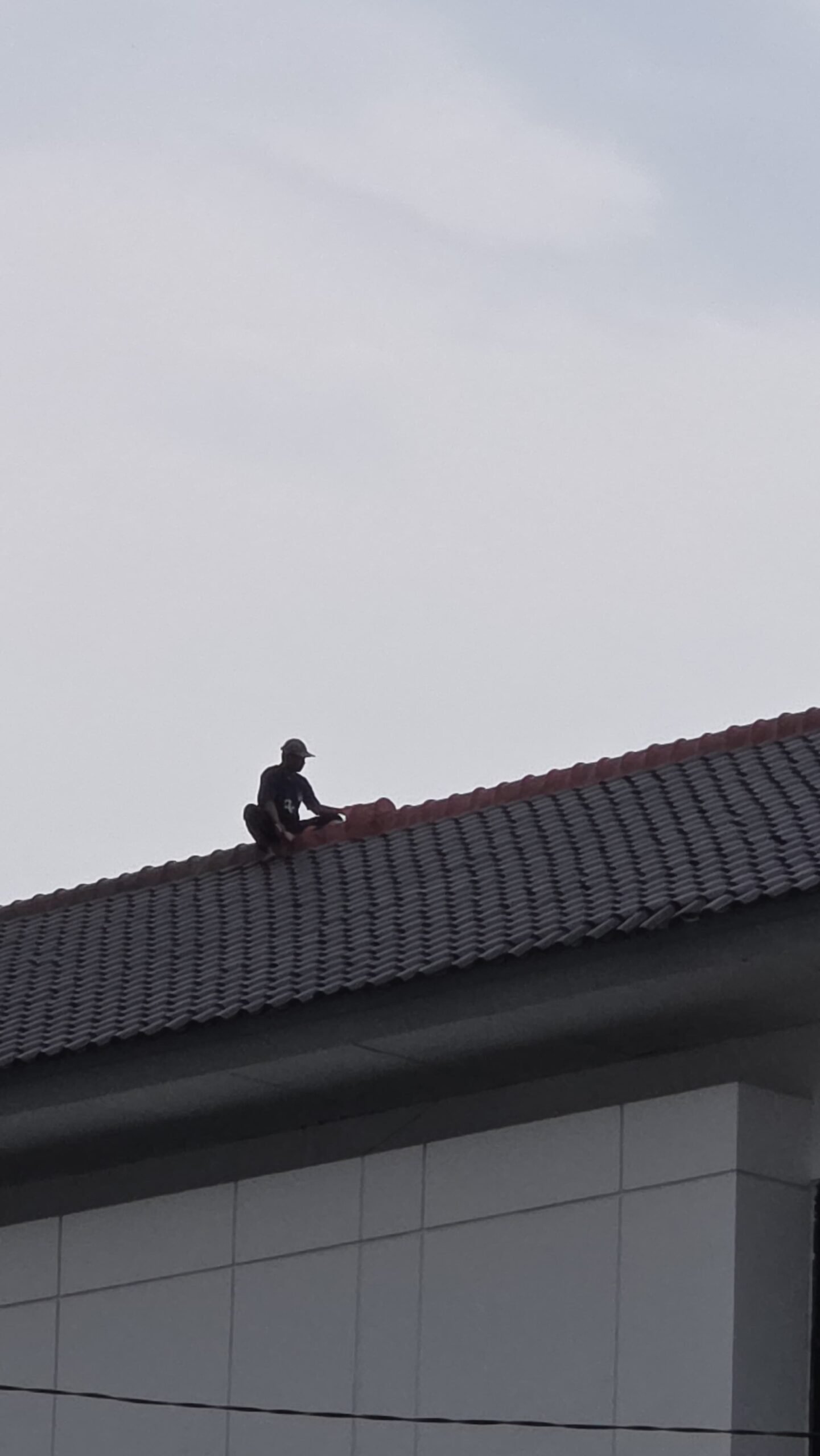Berdasarkan pantauan di lokasi, Rabu (11/2/2026), pria tersebut tampak sedang memperbaiki bagian atap atau genting gedung.
