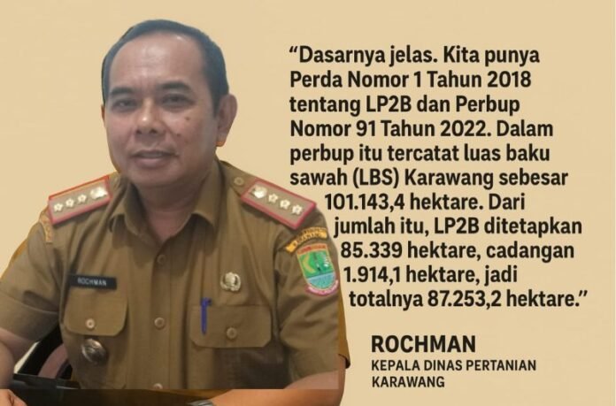 Kepala Dinas Pertanian Karawang, Rochman, menegaskan bahwa dasar data yang dipaparkan Bupati Aep memiliki landasan hukum yang jelas. “Dasarnya jelas. Kita punya Perda Nomor 1 Tahun 2018 tentang LP2B dan Perbup Nomor 91 Tahun 2022. Dalam perbup itu tercatat luas baku sawah (LBS) Karawang sebesar 101.143,4 hektare. Dari jumlah itu, LP2B ditetapkan 85.339 hektare, cadangan 1.914,1 hektare, jadi totalnya 87.253,2 hektare,” kata Rochman kepada awak media.