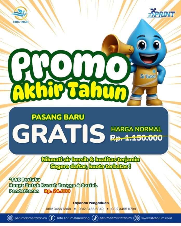 KARAWANG | SUARAKARAWANG.ID – Kabar gembira bagi masyarakat Karawang! Perumdam Tirta Tarum resmi meluncurkan Promo Akhir Tahun dengan penawaran spesial pasang baru sambungan air bersih secara gratis untuk pelanggan rumah tangga dan sosial. Program ini menjadi salah satu upaya perusahaan dalam memperluas layanan serta memastikan masyarakat memperoleh akses air bersih dengan kualitas terjamin.