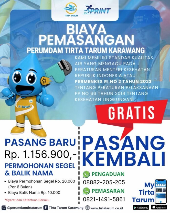 Melalui informasi resmi yang dirilis, Perumdam Tirta Tarum menetapkan biaya pemasangan baru sebesar Rp1.156.900 untuk pelanggan yang ingin mendapatkan sambungan air bersih di wilayah Karawang.