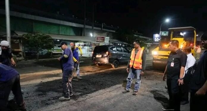 Pada pukul 22.15 WIB, Bupati Karawang H. Aep Syaepuloh, SE meninjau langsung proses perbaikan jalan yang dilaksanakan oleh Dinas Pekerjaan Umum dan Penataan Ruang (PUPR) Kabupaten Karawang.